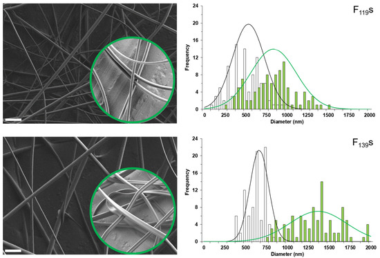 Representative field emission scanning electron microscopy (FESEM) images (left) and frequency distribution histograms of the diameter (right) of electrospinning-optimized F119s and F139s. Non-loaded fibers in main images and menthol-loaded ones inside the green-circle insets (scale bars: 5 µm). Each histogram was performed with the data obtained from several images (at least seven) until reaching 100 measurements (white and green bars correspond to non-loaded and menthol-loaded fibers, respectively). Best-fit adjustments to a Gaussian distribution are also correspondingly indicated with a line.