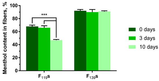 Stability over time of the menthol content in loaded F119s and F139s. The amount of menthol in acetone-dissolved fibers was analyzed by gas chromatography and mass spectrometry (GC-MS) at 0-, 3- and 10-days post fiber preparation. The data are represented in percentages relative to the amount of menthol initially added. Results are shown as the mean with standard deviation from three independent experiments performed in triplicate. Statistical analysis comprised two-way ANOVA corrected with Tukey’s test. ***, p < 0.001.
