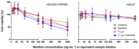 The potential toxicity induced in cells when treated with the electrospun fibers of this work was also evaluated. For these assays, HEK293-hTRPM8 and HaCaT cells were incubated for 24 h with different concentrations of the experimental samples previously dissolved in acetone. The concentrations used ranged from 7.8 to 1000 µM of menthol (for its calibration curve and menthol-loaded F119 samples), testing equivalent amounts of non-loaded F119S samples.