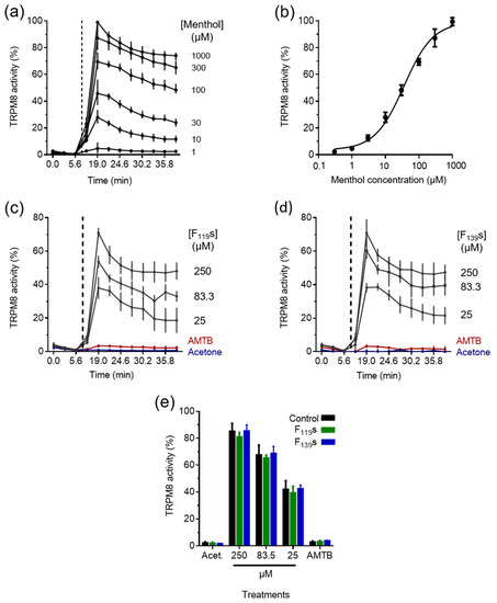 Activation of TRPM8 by the menthol contained in electrospun F119s and F139s in HEK293-hTRPM8 cells. All data correspond to intracellular Ca2+ measurements and are represented as mean percentages with standard deviation of the maximum response observed for each treatment to that of 1000 µM menthol (n = 3). (a) Representative dynamics of the intracellular Ca2+ in response to different menthol concentrations. (b) Dose–response curve to menthol. (c,d) Representative dynamics of the intracellular Ca2+ in response to different concentrations of menthol encapsulated in F119s and F139s, respectively. (e) Intracellular Ca2+ increases recorded in response to 250, 83.3, and 25 µM of free and encapsulated menthol, including as controls: samples without menthol and 0.05% acetone (Acet.), and the specific TRPM8 blocker AMTB at 10 µM against 83.3 µM menthol samples. Statistical analysis calculated from the datasets in (e) comprised two-way ANOVA corrected with Tukey’s test for multiple comparisons, but no significant differences were found between the treatment groups at each concentration.