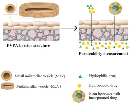 The next step in the complexity order of testing platforms is the use of in vitro skin models. There exist different model membranes for testing drug permeability: (1) non-lipid based membranes such as silicone membranes and the Strat-M™ membrane, which is composed of multiple layers of polyether sulfone, creating a morphology similar to human skin, including a very tight surface layer (stratum corneum) and (2) lipid-based model membranes, e.g., parallel artificial membrane permeability assay/PAMPA/and phospholipid vesicle-based permeation assay/PVPA/etc.) [2]. The structure of the PAMPA and PVPA systems are shown in Figure 1 and Figure 2.