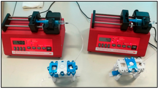 Two simultaneous “skin-on-a chip” experimental setups. The system consists of a programmable syringe pump and a flow-through dynamic microfluidic device [30]. The samples are collected below the diffusion system in the collection bench.