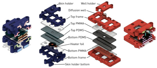 Skin-on-a-chip devices offer innovative and state-of-the-art platforms essential to overcome the limitations of other diffusion cell techniques [51]. In our laboratory, a novel microfluidic device concept has been designed for testing drug penetration through the skin (Figure 3). The generalized design is optimized for manufacturing with rapid prototyping techniques; CNC milling, polymer casting, laser cutting and 3D printing. The developed Microfluidic Diffusion Chamber (MDC) can be used for in vitro/ex vivo monitoring of the transdermal delivery of topical drugs.