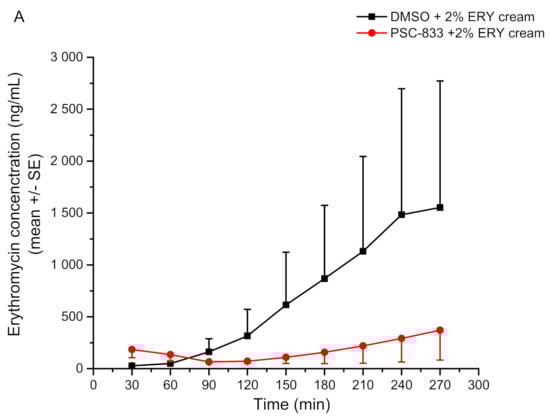 Skin penetration of erythromycin cream (ERY) and quinidine gel (QND) (Panel (A,B), respectively) across the freshly prepared excised young rat abdominal skin in the microfluidic chip. Concentration data are shown as means +/− SE, n = 3–5 [30]. The P-gp inhibitor (PSC-833) significantly reduced QND and ERY penetration through the skin.