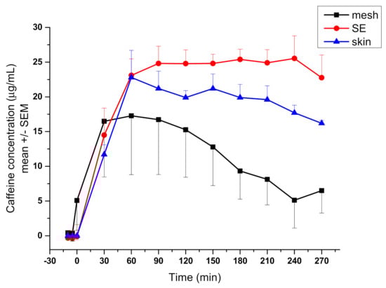Transdermal transport measurements using skin equivalent (SE) and human skin. Caffeine concentration in the collected fractions was measured by spectrophotometry and is shown as a function of time [58]. The difference between concentration readings from the marked mesh-only and SE samples is significant (p = 1.2 × 10−7, n = 12 in each group).