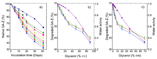 Degradation of GA-Z after incubation at 37 °C as determined by LC-UV. (a) Relative amount of remaining native protein vs. incubation time. Samples contained PBS buffer (25 mM, 125 mM NaCl, pH 7.0), 9 mg/mL, and 0% (●), 5% (■), 10% (▲), 15% (▼), 20% (◀), 30% (▶), 50% (◆), 70% (◓), and 90% (◒) v/v degraded protein and water activitv glycerol. (b) Relative amount of degraded protein and water activity (◆) vs. glycerol concentration (% v/v) after 41 days of incubation. (c) Relative amount of degraded protein and water activity (◆) vs. glycerol concentration (% n/n) after 41 days of incubation. (b,c) samples contained 4 (○), 6 (□), and 9 mg/mL (△) of GA-Z.