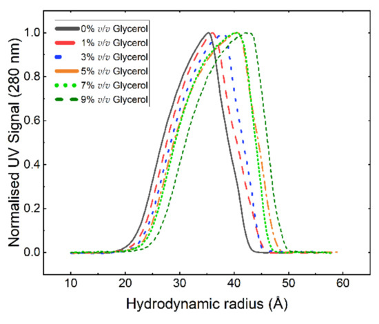 Normalised hydrodynamic radius distributions for GA-Z in PBS buffer (25 mM, 125 mM NaCl, pH 7.0) and 0–9% v/v glycerol. The recovery in mass, determined via UV signal (280 nm) of the analysed samples, was 83%, 87%, 87%, 96%, 81%, and 73%, respectively. The hydrodynamic radius was determined from AF4-UV elution times (Figure S4) using Equation 1. All analyses were performed in triplicate.