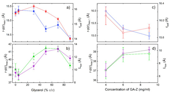 The r values at the second peak maximum, r-p(r)max,2 also varied with glycerol concentration and significantly increased up to 50% v/v glycerol (Figure 4c). The barbell model suggests that the length of the linker (Lbar) increased with glycerol concentration in a similar manner to the increase in r-p(r)max,2. Furthermore, the Kratky plot in Figure 3c shows that peaks corresponding to the scattering between the domains shift to higher q with increased glycerol concentration. This shows that protein conformations where the domains are more separated from each other were favoured (i.e., elongated conformations), which is in agreement with the increase in size observed with AF4-UV (Figure 2). Similar trends in conformational changes are seen with varying GA-Z concentrations (Figure 3f and Figure 4c,d), although the magnitude of these changes was smaller.