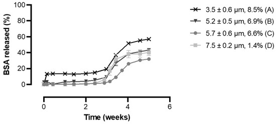 3.3. Effect of BSA Loading and Shell Thickness on the In Vitro Release of BSA from PDLG5002-Based Core-Shell Microspheres