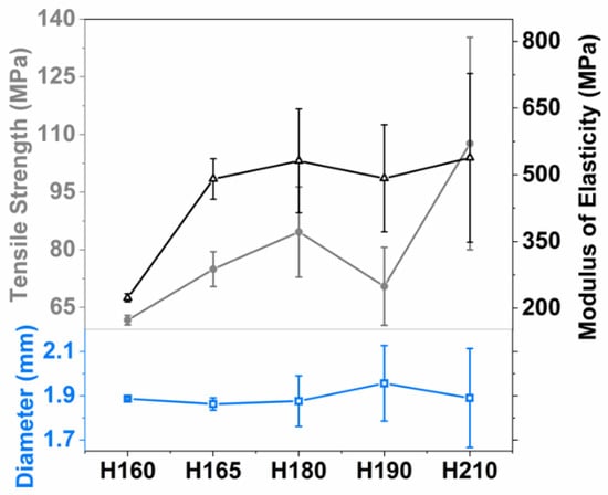 Mechanical properties and diameters of the filaments with varying HME processing temperatures, ranging 160–210 °C.