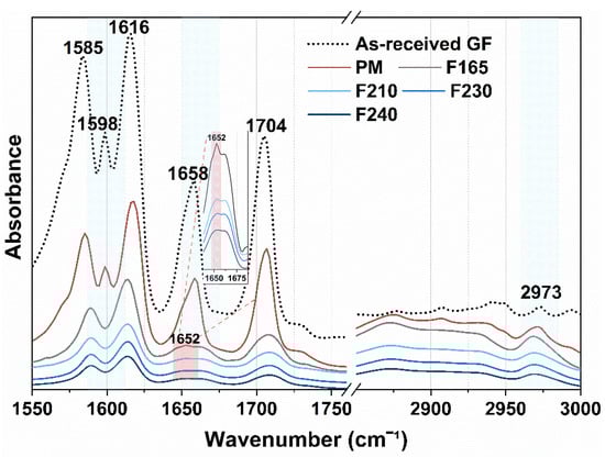 FT-IR spectra of as-received GF, physical mixture (PM) and 3D printed tablets through F165-F240.