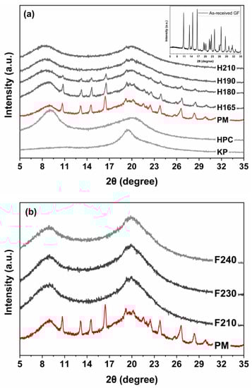The PM, filaments and printed tablets were examined using XRPD and DSC to identify any solid-state changes to GF after thermal processing in HME and FDM of as-received GF, HPC and KP. The XRPD diffractograms were presented in Figure 3. As-received GF showed characteristic peaks [], whereas polymers exhibited a halo pattern indicating their either amorphous nature or non-detectable amount of crystallinity, Figure 3a. The PM showed similar characteristic peaks, yet with lower intensity (see Figure S2, Supplementary Material for XRPD diffractograms of the GF and PM with the same scale range). This is expected due to the surface coverage and dilution of GF particles with the polymers [,]. The diffractograms of H165 and PM resembled along with their comparable peak intensities. The % crystallinity of GF in H165 was estimated to be 83.06%. That confirmed that GF particles mostly distributed [] within the polymeric matrix and remained largely crystalline. The reduced % crystallinity of GF, approximately ~17%, for H165 could be explained with the formation of amorphous GF stemming from temperature-induced drug-polymer miscibility [] (see Section 3.3). Further increasing the processing temperature in HME further lowered the peak intensities of H180 and H190, indicating a further reduction in % crystallinity of GF. Eventually, H210 showed a halo pattern, as the characteristic peaks of GF disappeared. Therefore, at 210 °C, ASDs loaded filament was produced. A similar observation was valid for FDM printed tablets F210 through F240, as all showed a halo pattern (see Figure 3b). These halo patterns confirmed that largely crystalline GF in the filament was successfully transferred to ASDs by fusion-assisted melting via FDM 3D printing at the temperature range of 210–240 °C. These outcomes were further supported by the DSC results, presented in the supplementary material to conserve space (see Figure S3, Supplementary Material).