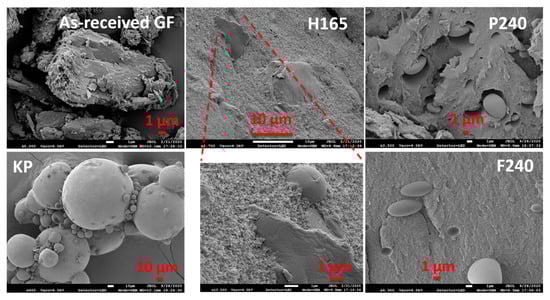 The SEM images of as-received GF and KP powders, the filament (H165) and printed tablets (P240 and F240) are presented in Figure 4 to assess the morphology of the particles after thermal processing in the HME and FDM. The as-received GF had an irregular shape while KP was spherical. The SEM image and enlarged view of H165 (Figure 4) also exhibit similar morphology of what appears to be GF (irregular) and KP (spherical) embedded particles in the matrix of H165. It is noted that the particles with irregular shapes did not appear in the cross-sections of printed placebo and drug-loaded tablets, P240 and F240, while spherical particles were observed in both, as GF would have melted in those cases at the processing temperature of 240 °C during 3D printing while KP particles remained intact to some extent. These outcomes are supported by the optical microscopy images (Figure S4, Supplementary Material).