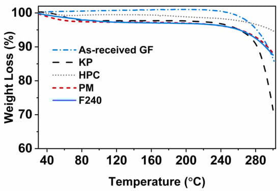 TGA thermograms of as-received GF, KP and HPC powders along with 3D printed tablet (F240).