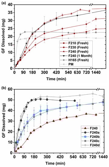 The drug dissolution profiles of all the printed tablets, discussed in Section 2.4, were tested under non-sink dissolution conditions and are presented in Figure 6. As a control, the physical mixture (PM) led to the lowest level of released GF. However, the mere presence of HPC-KP polymers enhanced the extent of GF released with respect to the thermodynamic solubility of GF (14.2 mg/L) []. The enhancement is likely due to the dissolution of the water-soluble polymers in the dissolution medium, which is in line with the previous reports [,]. The H165 and PM showed comparable dissolution rates and extent of GF released, with H165 being slightly higher. This could be attributed in part by the presence of small fraction of amorphous GF in H165 (refer to Section 3.3 and Section 3.4), which has higher kinetic solubility than its crystalline counterpart and partly by deagglomeration of as-received GF particles into polymer matrix due to HME processing. Deaaglomeration of GF seems to also evident in the content uniformity results (Table 4). For 3D printed tablets (Figure 6a), several trends were observed: (i) Initial GF release was slower for F210–F240 as compared to PM and H165, which is typical for most FDM 3D printed tablets because they are inherently dense and require longer time for drug dissolution [,,]. (ii) There was no desupersaturation of GF, likely due to the gradual GF release from the matrix having water-soluble polymers, acting as crystallization inhibitors. (iii) All F210–F240 printed tablets had a higher extent of GF supersaturation compared to H165 and PM (also see Table S1, Supplementary Material) because of fusion-assisted ASDs formation, which increased with the printing temperature due to higher drug-polymer interactions (refer to Section 3.3) implying an increasing amount of amorphization (amorphous fraction of GF); F240 being the highest (153%). In addition, it is likely that the incorporation of 10 wt% KP into the formulation forged strong bonds via drug-polymer interactions, provided high miscibility with GF-HPC and reduced surface tension []. F240, after being stored over one month at the ambient conditions, had comparable drug release performance to the freshly prepared F240, Figure 6a, indicating the presence of strong drug–polymer interactions.