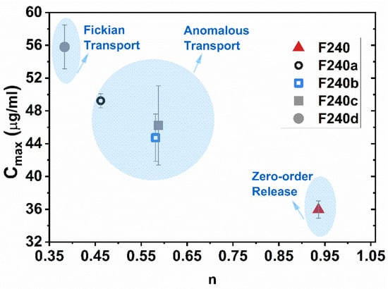 The release kinetics of GF dissolution data were analyzed to mechanistically analyze the supersaturation performance of various designs by employing the Korsmeyer–Peppas model, Equation (2). Please refer to Table S1, Supplementary Material, to view the details of the fitting parameters including the R2 values. The results (see Figure 7) that show Cmax and release exponent, n, suggested three different release mechanisms based on the exponent values for relevant geometry (refer to Section 2.10): (i) zero-order for F240, (ii) anomalous release transport for F240a–c and (iii) Fickian diffusion for F240d. In conjunction with the level of GF supersaturation and Cmax, Fickian transport appeared to be the most pharmaceutically relevant where the high extent of supersaturation was sustainable. The presence of dissolved polymers might have acted as crystallization inhibitors in the dissolution media, promoting the higher, sustained GF supersaturation during Fickian transport. These outcomes are in line with Sun et al. [], where diffusion-controlled release mechanism represented the gradually increasing, yet sustained supersaturation. Nonetheless, further investigation would be required to better understand the confounding effects of the apparatus type and speed, dissolution pH and medium [,] as well as the extent of printed tablet density, on dissolution and supersaturation behavior.