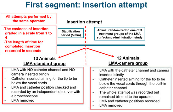 The study protocol was divided into two separate, independent segments denominated “Insertion attempt” (first segment) and “LMA surfactant administration,” respectively. The first segment was designed to assess the feasibility of blindly passing a delivery catheter past the vocal cords using an LMA as a steering conduit. We tested two different LMAs (“Insertion Attempt,” Figure 2). After the stabilization period, all studied animals were randomized into two groups using one of two types of LMA (Figure 1): LMA-camera group (with a camera and a dedicated catheter channel; Figure 1c,d) and LMA-standard group (no camera, no catheter channel; Figure 1a,b). The same operator performed all insertion attempts in both groups, but had no access to the video recordings taken during and after the procedure. We lubricated the tip of the LMAs with lidocaine gel to facilitate the introduction and give more comfort to the animal. In the LMA-camera group (n = 12 animals), when the LMA was in place, we inserted the delivery catheter through the dedicated built-in channel to a predetermined length so that the tip was expected to be inside the trachea. Although the LMAs with the catheter channel also had a built-in camera, the continuous video recordings of the procedure were concealed from the operator. In the LMA-standard group (n = 13 animals), we positioned the LMA and then inserted the catheter through the central lumen to a predetermined length so that the tip was expected to pass the vocal cords. In this group, when the delivery catheter was already in place through the central lumen, the position of the LMA and catheter was documented and recorded by an independent observer with a 3.8 mm disposable fiber bronchoscope (Ambu®aScope™ 4 Broncho Slim, Ambu A/S, Ballerup, Denmark).
