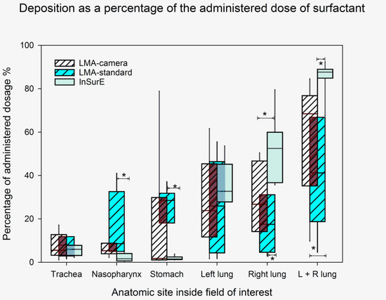Deposition as a percentage of the administered dose. Box plot (median, 5th, 95th percentiles) for the deposition calculated as a percentage of the administered dose for the different anatomical sites inside the region of interest. * is p < 0.05 (analysis of variance with Dunn’s post hoc test).
