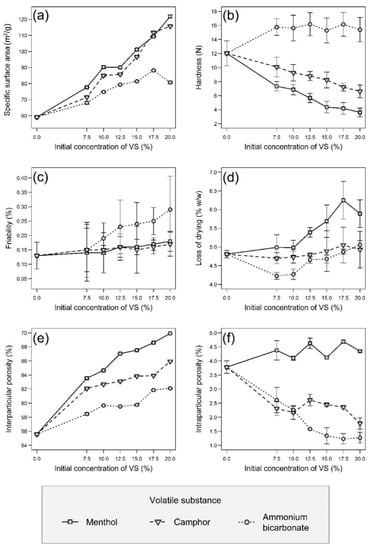 34]. In order to form pores and thus increase the SSA of the prepared samples, volatile substances (VSs) such as menthol (M), camphor (C) or ammonium bicarbonate (AB) were added to the powder mixture in various concentrations, while their particle size was pre-adjusted so as not to exceed 500 µm. Subsequent drying of the samples at 60 °C removed these volatiles, which left pores in the pellet structure, which should result in the increase in the total SSA of the carriers. In addition to mechanical and flow properties, the SSA of the samples was evaluated by the BET method [