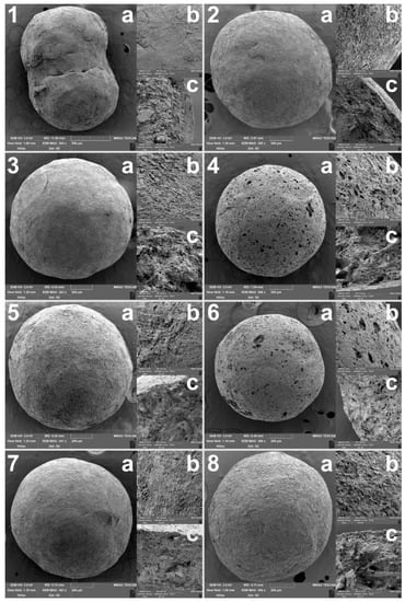 38]; they could also be used in analytical detection systems such as detection tubes. In this particular experiment, the modified carriers were intended to be impregnated with a second-generation detection reagent PY-OPD and subsequently used in the glass detection tubes as a means for detecting CWAs, such as phosgene. Although by changing the reagent used, such carriers can also be used to detect other CWAs and toxic substances. Therefore, the main objective of this study was to develop and characterize a new type of carriers for interdisciplinary applications, with their primary use in second-generation DTs, and to determine their most suitable composition with the emphasis on achieving high SSA, while maintaining other suitable physicochemical properties of the samples, such as the appropriate hardness, low friability, high sphericity and good flow properties, as will be discussed in more detail below.