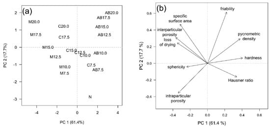 43]. In the scores plot, both dependency trends in data are clearly evident. The distinction between pellets based on the VS type is obvious approximately in the direction of the PC 1 axis, while along the PC 2 axis, the effect of VS presence and concentration is dominant. By comparing the scores plot and loadings plot, it can be deduced that the samples differed depending on the presence and type of the volatile substance (N, M, C, AB) mainly on the basis of parameters such as hardness (AB > C > M), pycnometric density (AB > C > M) and sphericity (statistical testing revealed an inconclusive trend). Depending on the VS concentration used, the samples differed mainly on the basis of the specific surface area and interparticular porosity (both positive correlation with VS concentration). Both mentioned influences then equally (the combination of type of VS and its concentration) played a role in the case of the remaining parameters.