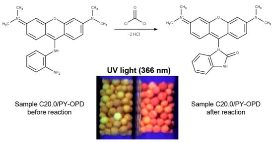 Figure 4, which also depicts the red fluorescence of the sample C20.0/PY-OPD after the reaction with diphosgene/phosgene under UV light at 366 nm compared to the same sample before the reaction. In addition, it was found that although all samples to some extent (sample N and samples AB distinctly less) provided a red-violet color upon the reaction with phosgene/diphosgene, which can be seen in