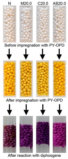 In cooperation with Oritest, 100 g of each sample (except N0) was impregnated with 50 mL of a 1% solution of PY-OPD (synthesized by the University of Chemistry and Technology, Prague, Czech Republic) in chloroform (Merck, Darmstadt, Germany) and air-dried. The impregnated samples were subsequently filled into glass detection tubes (d = 5 mm) to form a 10 mm long layer and the tubes were hermetically sealed. The samples were then tested with diphosgene, which, unlike phosgene, is in liquid form under normal conditions and can therefore be handled better, while both substances having comparable toxicity. A detailed description of the methodology of impregnation, filling into detection tubes and testing of impregnated samples was described in the related study [