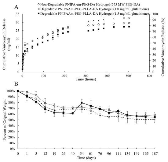 The VAN release from 1 mL non-degradable PNIPAAm-PEG-DA hydrogels compared to hydrogels containing PEG-PLLA-DA and 1.0 mg/mL and 1.5 mg/mL glutathione, respectively, can be found in Figure 2A. Non-degradable hydrogels cumulatively released more than 2 mg/mL (p < 0.05) VAN than both biodegradable hydrogels at 5, 12 and 24 h. Following 48 h and until the conclusion of this study, the non-degradable hydrogels consistently released statistically more VAN than those containing 1.5 mg/mL glutathione but statistically less than those containing 1.0 mg/mL glutathione. In total, the non-degradable hydrogels released 29.4 ± 0.08 mg/mL VAN, while the hydrogels containing 1.0 mg/mL and 1.5 mg/mL glutathione 32.5 ± 0.05 mg/mL and 27.4 ± 0.03 mg/mL, respectively.