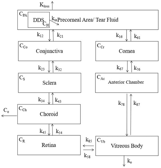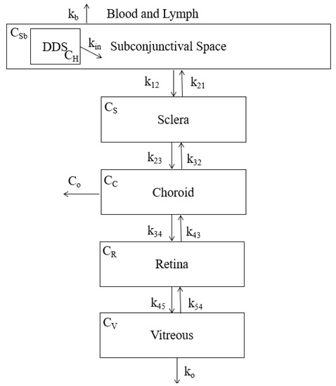 The equations generated from the subconjunctival model shown in Figure 3 are shown below in Equations ((2)–(6)).