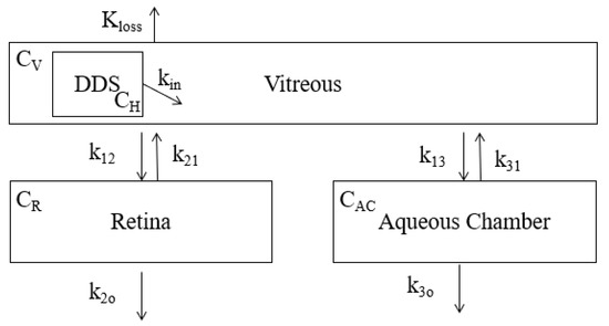 The equations generated from the intravitreal model shown in Figure 5 are shown below in Equations (15)–(17).