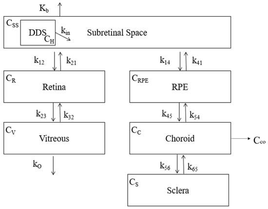 Rate constants were selected based on an extensive literature review. The sclera is permeable to hydrophilic compounds [35,36,37,38]. Permeability to the retinal pigment epithelium is 1–2 orders of magnitude slower than in the sclera [39]. Surprisingly, experiments have shown that the choroidal blood flow has far less contribution to the retinal and subconjunctival drug concentrations than previously thought [40,41,42]. Alternatively, many researchers continue to consider the choroidal blood flow as a substantial obstacle to successful drug penetration into the retina [43]. Scenarios with and without high choroidal blood flow contributions were considered. The rate constants describing backflow between compartments were considered to be negligible and therefore set to zero (0) [34].