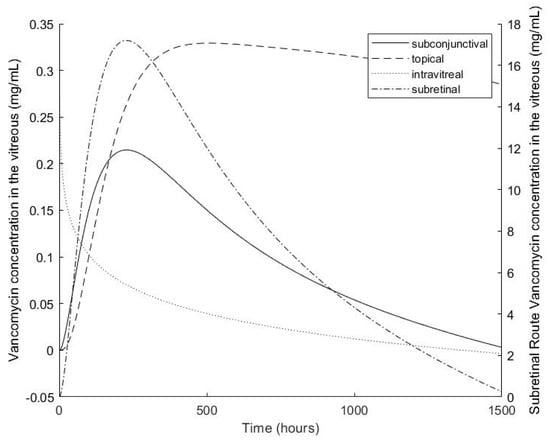 Vancomycin concentration in the vitreous over 1500 h as predicted by compartment models of a DDS containing drug originating topically, subconjunctivally, intravitreally and subretinally and simulated used MATLAB version R2019a software.