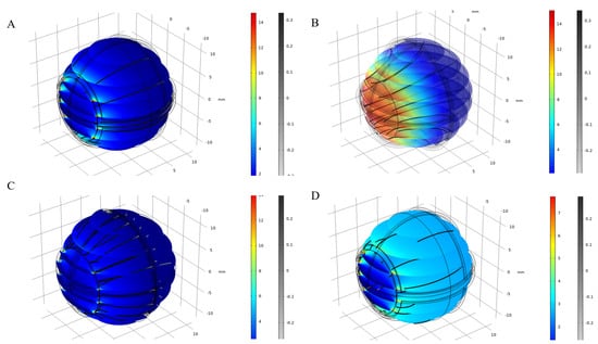 COMSOL Multiphysics Model simulation of drug entry routes originating from (A) the subconjunctival, (B) topically, (C) the vitreous and (D) the subretina and penetrating into the vitreous. The concentration profile is demonstrated using both streamline and slices. The right color bar represents the concentration spectrum for the streamlines and the left represents the slices.