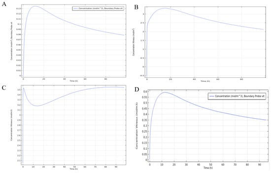 Final results from the COMSOL 3D model simulation were displayed as a diffusion profile over a period of 100 h (Figure 9). According to this model series, the subconjunctival, topical, and subretinal delivery routes peaked at approximately ~10 h at ~0.135, ~3.75 and ~0.59 mol/m3, respectively. The intravitreal delivery route showed an almost immediate concentration of ~3.6 mol/m3 followed by an initial decline and subsequent increase in concentration that was maintained for the duration of the simulation.
