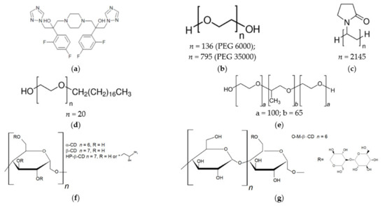 Structure of the studied compound S-119 (a), and the excipients: PEG (b); PVP (c); Brij S20 (d); F127 (e); α-CD, β-CD, HP-β-CD (f) and O-M-β-CD (g).