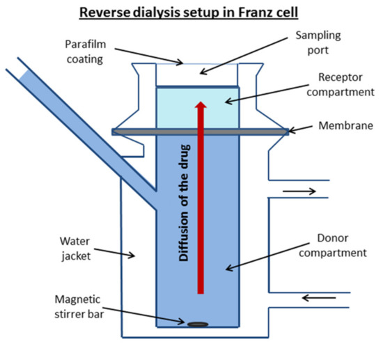 Permeability experiments were performed using the reverse dialysis set-up adapted to the Franz diffusion cell (PermeGear, Inc., Hellertown, PA, USA). This method was successfully applied by di Cagno et al. [36] for the permeability evaluation of a whole set of diverse drugs. The donor solution of the investigated compound was placed in the lower chamber. The membrane was mounted between the donor and acceptor chambers. At the start of the experiment, the upper (acceptor) compartment was filled with the respective pure buffer. The donor solution was stirred with a magnetic stirrer bar. The samples of 0.5 mL were withdrawn from the receptor solution each 30 min over 5 h and replaced with the same volume of pure buffer. The volume of the donor solution in the lower compartment was 7 mL and the receptor volume was 1 mL. A schematic diagram of the equipment is illustrated in Figure 2.
