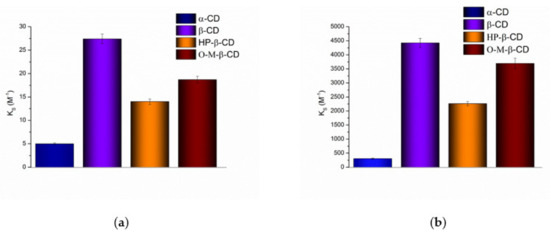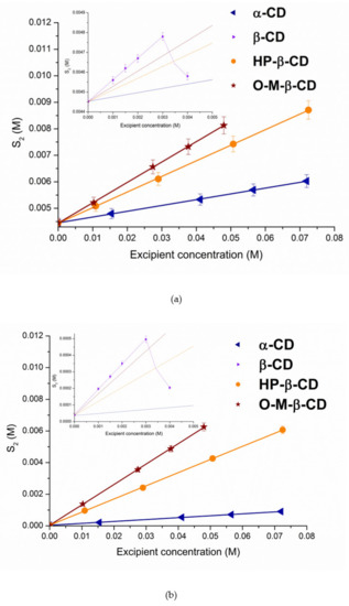 The solubilizing potential of cyclodextrins towards S-119 antifungal was evaluated using the stability constants (KS) of the complexes derived from the phase solubility profiles (Figure 3) calculated by Equation (1). According to the Higuchi and Connors classification [35], at both pHs, the phase solubility diagrams for α-CD, HP-β-CD and O-M-β-CD are of AL-type, indicating the formation of soluble complexes. As opposed, the BS-type diagrams with linear region from 0 to 0.003 M CD concentration (Figure 3, inserts) were obtained for β-CD. The observed regularity is commonly encountered in case of-CD complex formation. It can be explained by the formation of supramolecular complexes of high molecular weight with limited solubility as a rule precipitating in solutions of naturally occurring CDs, especially β-CD [37]. An insoluble complex was precipitated, causing turbidity of the solvent and lowering of the compound concentration. The slope values of the phase-solubility diagrams are lower than unity, indicating the 1:1 stoichiometry of the complexes in the investigated range of cyclodextrin concentrations [21]. The calculated KS values of the complexes are illustrated in Figure 4 and listed in Table S2 (SI) along with the complexation efficiency and drug:CD molar ratio.
