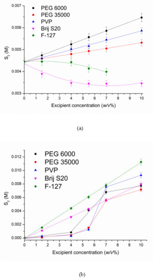 A pronounced effect of pH on the solubility in different polymer solutions was estimated. A linear dependence of the solubility in the presence of both PEGs and PVP is observed in acidic solution (Figure 5a) with the following range of polymers in accordance with the solubility enhancement at 10 w/v% polymer concentration: PEG 6000 (1.45-fold) > PVP (1.32-fold) > PEG 35000 (1.20-fold). As follows, the increase in S-119 solubility is rather low and very close for all polymers used.
