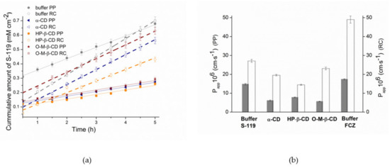 As evident from Figure 6a, for pure buffer and all CD solutions, the flux J (slope of the kinetic dependence) through the RC membrane is higher than the PP barrier, possibly due both to the high retention of a lipid layer in the PP and the diffusion of both drug and drug/CD complexes through RC (in case of CD solutions). The same regularity of the permeability coefficients is illustrated in Figure 6b. The comparison of the results for S-119 and FCZ revealed an essentially faster diffusion of FCZ through both barriers (1.8- and 1.2-fold for RC and PP, respectively). An essentially larger value of Papp for FCZ through RC as compared to S-119 can be explained by its higher diffusion coefficient in water. As stated by Avdeef et al. [62], diffusion coefficients in pure water (Dw) at room temperature can be calculated by the empirical formula: