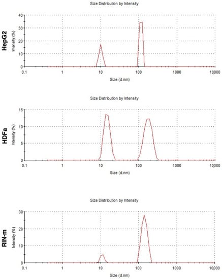 After isolation, exosomes obtained from HepG2, HDFa and RIN-m cells presented a narrow size distribution (Figure 1), with average sizes of 153 ± 64, 107 ± 101 and 137 ± 127 nm for the HepG2, HDFa and RIN-m cell-derived exosomes, respectively. Likewise, the measured zeta potential values were around −8.00 ± −7.18, −2.65 ± −2.07 and −4.13 ± −2.25, respectively.