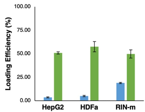 The total concentration of FITC–insulin loaded in each type of cell-derived exosome was calculated using the results obtained by a fluorescence measurement, according to our FITC–insulin fluorescence assay parameters (excitation/emission = 485/528 nm), as shown in Table 1. The loading properties of HepG2-, HDFa- and RIN-m-derived exosomes were evaluated through the previously mentioned treatments. The efficiency showed significant differences (p < 0.05) between the loading conditions, as shown in Figure 3. The highest loading efficiency was detected with the electroporation at 200 V and 50 µF treatment, with a total concentration of exosomes of 400 µg/mL (50.75 ± 1.2%, 57.42 ± 5.47% and 49.70 ± 4.32% for HepG2, HDFa and RIN-m exosomes, respectively). Although the loading efficiencies present statistically significant differences, the efficiencies are apparently in the same range of values, a fact that may be associated with their similar particle size and zeta potential, as was previously mentioned in this work. These loading efficiencies are visibly higher than the efficiencies in the RT treatments (3.47 ± 0.56%, 4.98 ± 0.71% and 18.84 ± 0.62% for the HepG2, HDFa and RIN-m exosomes, respectively). As expected, the electroporation method presented remarkably high efficiency. As has been reported in previous studies, voltages between 140 V and 200 V show a higher encapsulation efficiency compared with lower voltages. On the other hand, variation of the capacitance (0–400 µF) does not compromise the efficiency of the electroporation procedure [37]. To exemplify this, Tian et al. [38] previously reported a similar drug loading experiment using human breast cancer-derived exosomes and doxorubicin (Dox), a well-known chemotherapeutic agent. To load the exosomes with Dox, they also tested two different methods: electroporation at 350 V and a RT co-incubation at 37 °C for 30 min without electroporation. According to their results, Dox was hardly detectable in the RT incubation sample, demonstrating the essential role of electroporation in drug loading [38]. Moreover, the electroporation loading efficiencies were higher than some already reported for the encapsulation of compounds with a lower molecular weight. In addition, Kim et al. [39] obtained loading efficiencies of 28.29% after a 1000 kV electroporation in paclitaxel encapsulation. Regarding the possible effect of the electroporation protocol on insulin’s stability, several studies have confirmed that this electrical protocol is safe and does not fragment the insulin molecule. Moreover, the same studies suggested that coupling electroporation with electroosmosis techniques has helped to achieve a greatly increased transport for insulin in in vivo models [40].