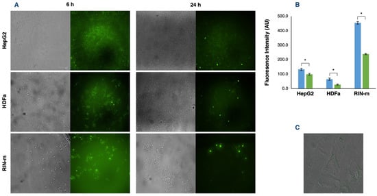 Exosome uptake by HepG2, HDFa and RIN-m cells. (A) Fluorescence microscopy images of HepG2, HDFa and RIN-m cells incubated with their respective exosomes loaded with FITC–insulin after 6 and 24 h. (B) Fluorescence intensity quantification after 6 (blue bars) and 24 h (green bars). The bars represent the mean intensity and the standard error. * Significant differences between treatments (Student’s t-test; p < 0.05). (C) Fluorescence microscopy image of an HDFa cell 6 h after exosome co-incubation. Loaded exosomes can be visually located inside the cytoplasm, dispersed between the cytosolic side of the plasma membrane and the perinuclear region.