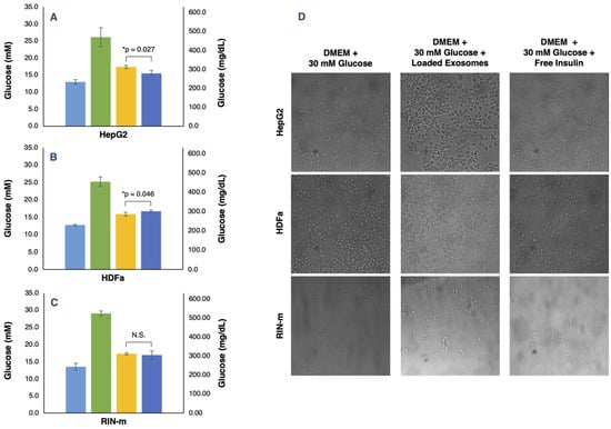 In vitro determination of glucose concentrations in HepG2, HDFa and RIN-m cell lines treated with DMEM + 10% FBS (light blue bars), DMEM + 30 mM glucose (green bars), DMEM + 30 mM glucose + insulin-loaded exosomes (yellow bars) and DMEM + 30 mM glucose + free insulin (dark blue bars). (A) HepG2-derived exosomes and free insulin treatments were significantly different (p < 0.05), showing lower glucose levels in the DMEM + 30 mM glucose + free insulin treatment. (B) HDFa-derived exosomes and free insulin treatments presented significant differences (p < 0.05), showing lower glucose levels in the DMEM + 30 mM glucose + insulin-loaded exosome treatment. (C) Loaded RIN-m derived exosomes and free insulin treatments did not present significant differences (p < 0.05), showing equal glucose concentration levels. (D) Morphological and cell population variation for the DMEM + 30 mM glucose, DMEM + 30 mM glucose + insulin-loaded exosomes and DMEM + 30 mM glucose + free insulin treatments in the HepG2, HDFa and RIN-m cell lines. Brightfield images were captured 24 h after starting each treatment. The error bars in the graphs represent the mean concentration plus the standard error. * Significant differences between treatments (Student’s t-test; p < 0.05); N.S. represents non-significant differences.