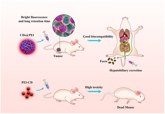 Top: The biodistribution, clearance, and systemic biocompatibility of CDs@PEI nanoparticles in mice; bottom: PEI-CD single carbon dots showed high toxicity in the animal.