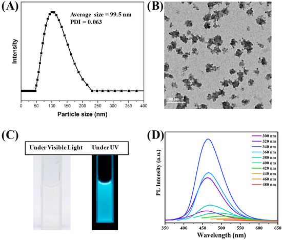 (A) Hydrodynamic size and distribution of the nanoparticles measured by the dynamic light scattering in water. (B) TEM image of morphology of CDs@PEI nanoparticles. (C) Photos of CDs@PEI solutions under visible and UV lights (irradiation with 365 nm UV light). (D) Photoluminescence spectra of CDs@PEI nanoparticles under excitation wavelengths from 300 nm to 480 nm.