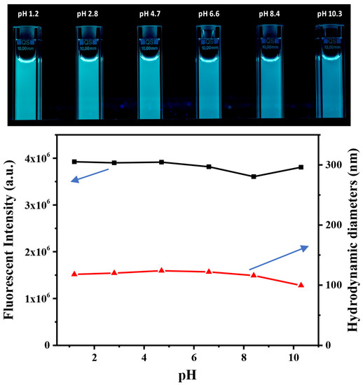 Top: Appearance of CDs@PEI solutions at pHs between 1.2 and 10.3 under UV light (irradiation with 365 nm UV light); bottom: the fluorescent intensities (blank line) and particle sizes (red line) of CDs@PEI nanoparticles at different solution pHs.