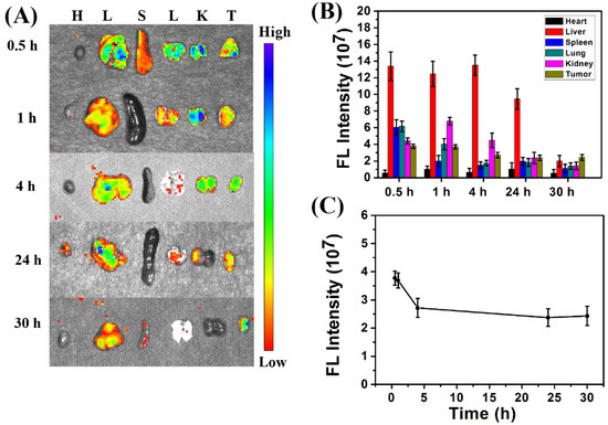 (A) Fluorescence image of ex vivo tissues (H, heart; L, liver; S, spleen; L, lung; K, kidney; T, tumor) isolated from mice after injection of CDs@PEI nanoparticles at 0.5, 1, 4, 24, and 30 h. (B) Average fluorescence (FL) intensities of major tissues and tumor at the designated time interval. (C) FL intensity curve of the tumor with specific time point.