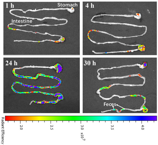 To further study the clearance route of the CDs@PEI nanoparticles, the stomach and intestine of the treated mice were isolated and examined with the ex vivo fluorescent images (Figure 7). Strong fluorescence signals were observed from the intestine at 24 h after injection of the CDs@PEI nanoparticles. At 30 h, the signal intensity significantly reduced, which may attribute to the clearance of the CDs@PEI nanoparticles via feces. Therefore, the results of the clearance route suggest that the CDs@PEI nanoparticles were mainly excreted from the intestine in the feces. In addition, the images of the liver shown in Figure 6A also illustrate strong fluorescence signals, indicating the hepatobiliary excretion of the CDs@PEI nanomaterials. It has been reported that glomerular filtration by the kidneys is highly size-selective [40,41]. Previous in vivo biodistribution studies of single carbon dots with a diameter less than 10 nm proved that the kidneys were the main clearance organ [42,43,44]. Our results indicate that the CDs@PEI nanoparticles with approximately 100 nm in diameter could be excreted from the intestine in the feces.