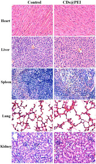Female BALB/c mice were allowed to adapt to the environment for 1–2 weeks. When the mice grew to a weight of around 20 g, they were administered with CDs@PEI (5 mg/kg, 100 µg nanoparticles injected to mice) through tail vein injection. The control group was given normal saline. Fourteen days after the injection, the mice were sacrificed, and their major organs were harvested for routine hematoxylin and eosin (H&E) staining.