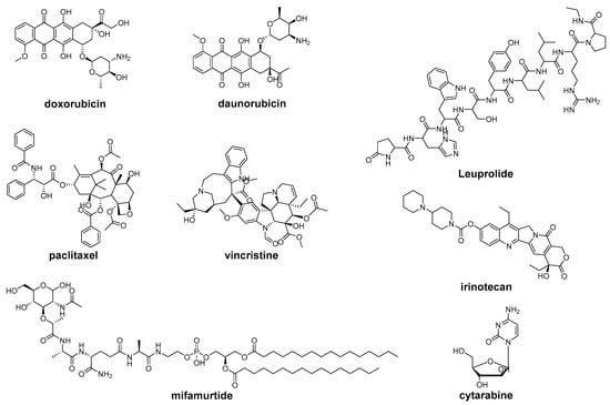 Molecular structures of doxorubicin, daunorubicin, leuprolide, paclitaxel, vincristine, mifamurtide, irinotecan, and cytarabine.